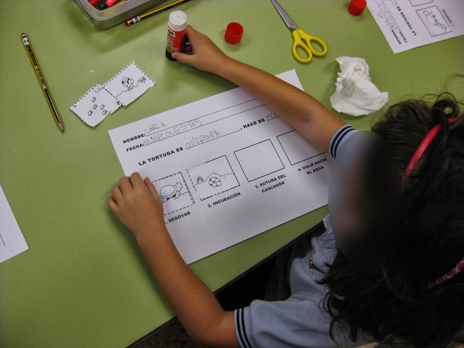 Así que para que no se nos olvidase hicimos una ficha donde teníamos que ordenar la secuencia de nacimiento de una Tortuga Marina como nuestra mascota LUNA, y completar la frase:
