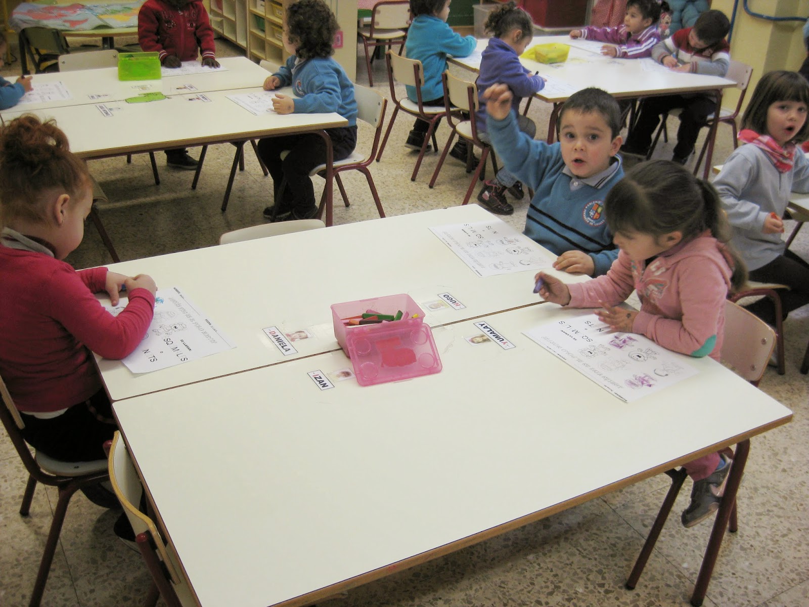 Después de identificarlos, las seño nos explicó que solamente teníamos que pintar a los niños que vivían en el Polo Norte. Pero observando detenidamente la ficha, también nos dimos cuenta de que algunas letras estaban hechas con puntitos y le preguntamos a la seño si las teníamos que repasar. Evidentemente, atinamos de nuevo en nuestra suposición xD
